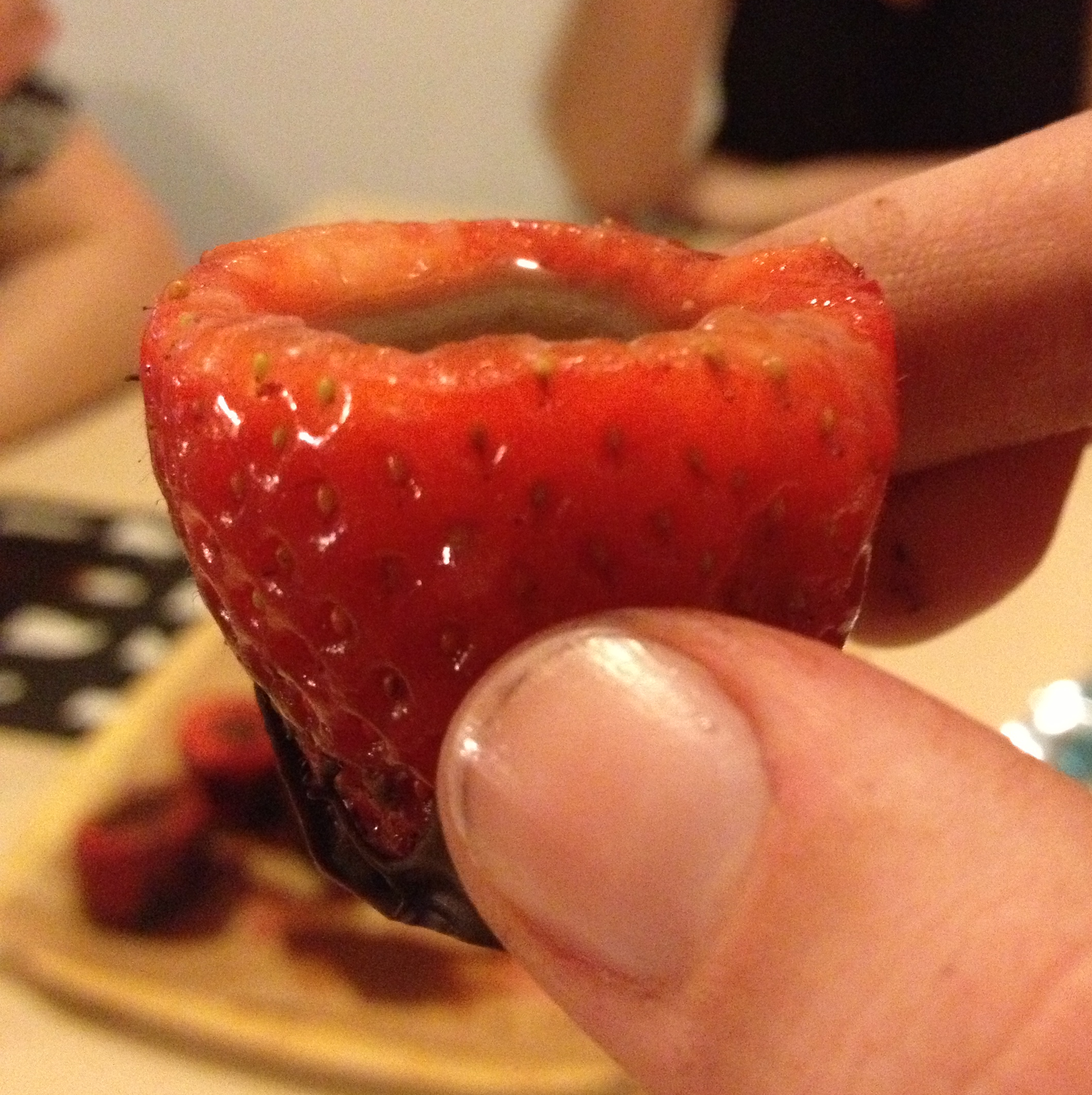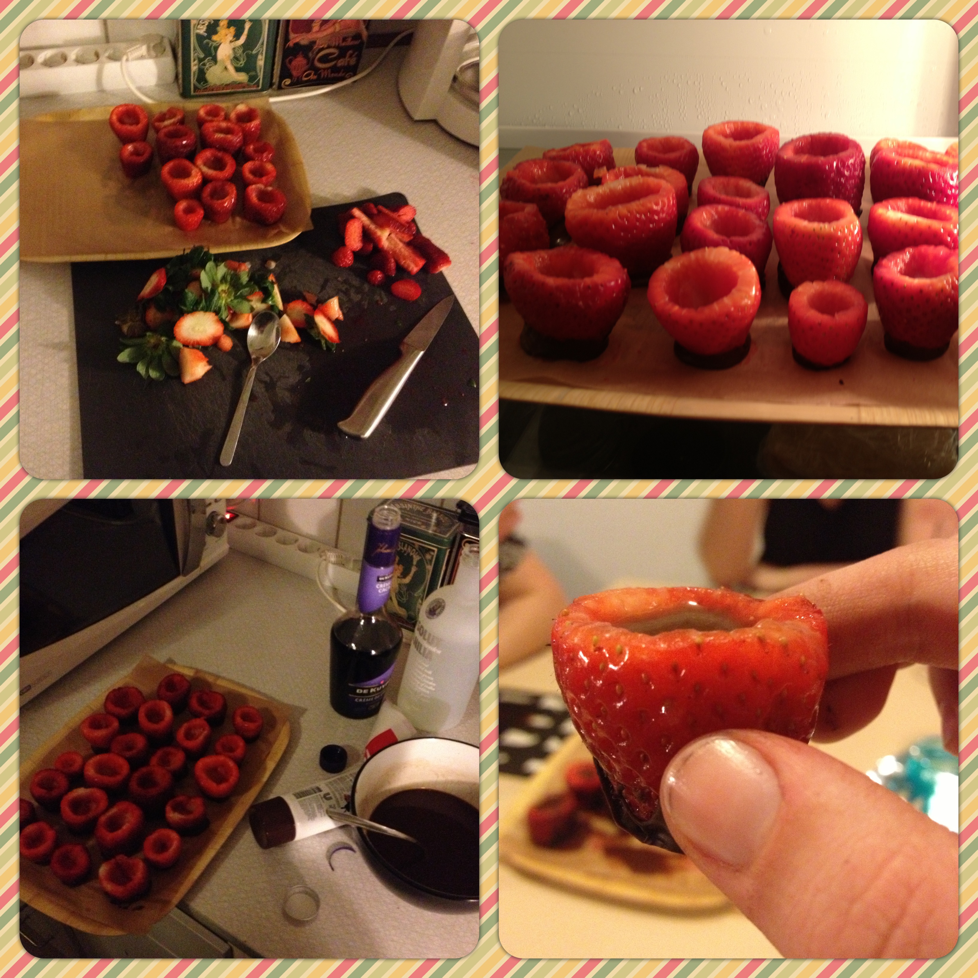Tvätta jordgubbarna, skär bort spetsen (så att de kan stå upp) och gröp ut hål i dem. Enklaste tyckte vi var att skära bort hela vita stammen inuti och en bit av toppen samtidigt som vi snoppade bort blasten.
