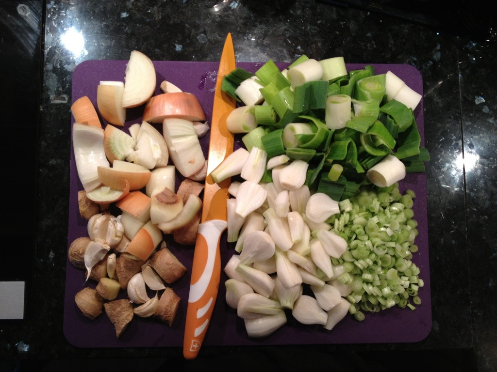 Medan grisfötter och kycklingskrov kokar upp förbereder du grönsaker. Grovhacka gul lök, ingefära, purjolök och de vita delarna på salladslöken. Skär tunna skivor av de gröna delarna på salladslöken och spara dem till garnering/topping. Du kan frysa in dem i små portionspåsar om du vill. Krossa vitlöken med knivbladet. Hetta upp oljan i en stor stekpanna och stek gul lök, ingefära och vitlök tills de har ordentligt med kolbildning (cirka 15 minuter).