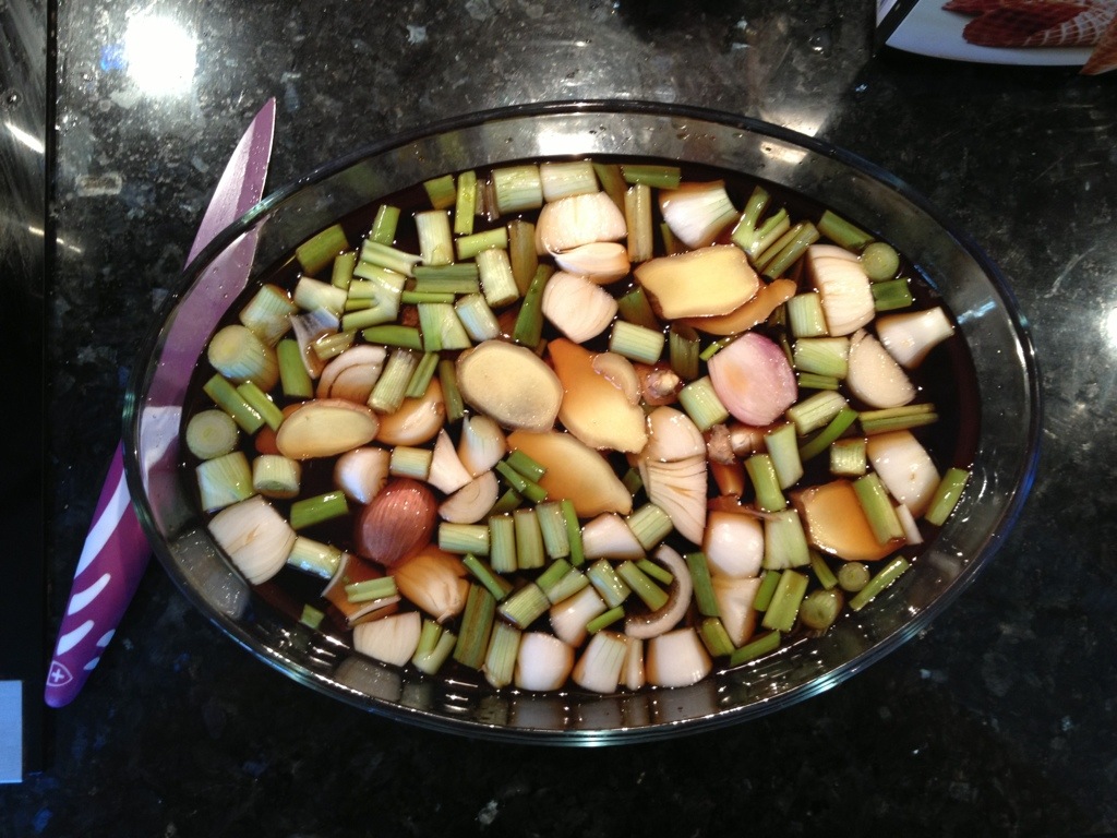 Värm upp ugnen till cirka 135°. Bind ihop karrén med grillsnöre så att den blir så rund det går. Grovhacka salladslöken, krossa vitlöken med knivbladet, skiva ingefäran grovt och dela schalottenlöken på mitten.