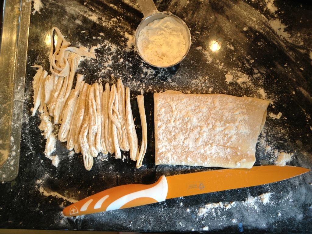 Nu är det dags att börja koka rikligt med vatten i en stor kastrull. Skär sedan degplattan i smala strimlor. Mjöla vartefter. Trassla upp de skurna nudlarna försiktigt.