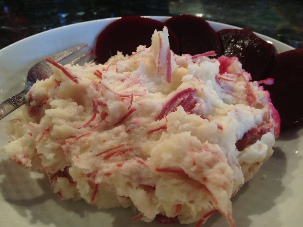 Häll av spadet från köttet. Pilla isär salta biten så det blir tunna strimlor och vänd ner dem i moset. Servera tillsammans med rödbetor.