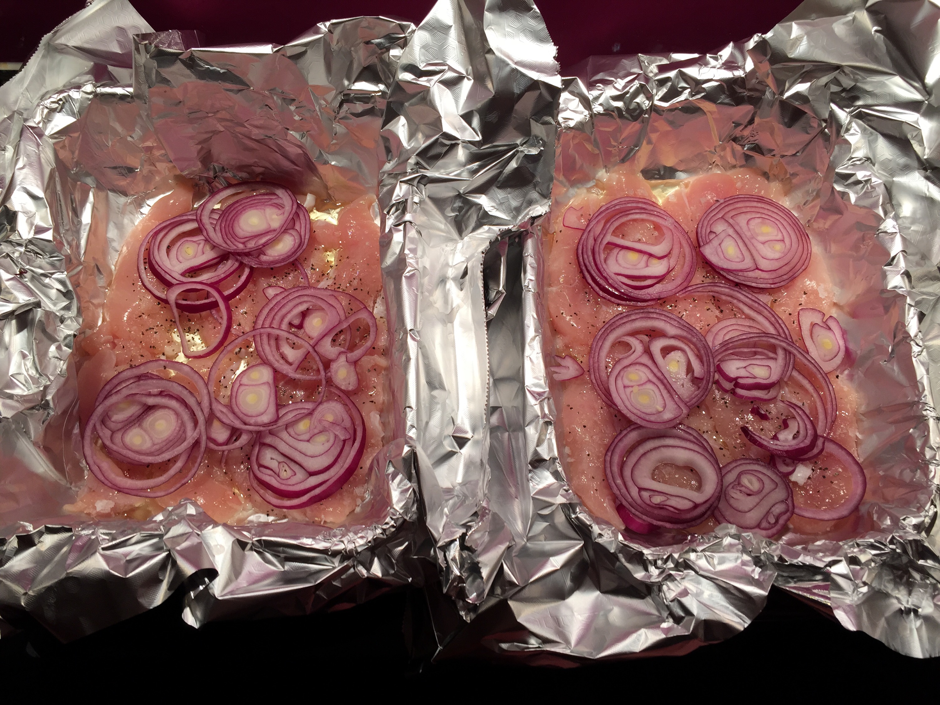 Lägg en bit folie i en stor ugnsfast form. Skölj av kycklingfiléerna och torka dem. Lägg dem i formen, i ett jämnt lager (inte ovanpå varandra). Ringla över olivolja, salta och peppra. Skiva rödlöken tunt och fördela skivorna över kycklingen. Vik över folien och knöla ihop öppningen, så det blir ett foliepaket. Ställ in formen i ugnen i 20 minuter.