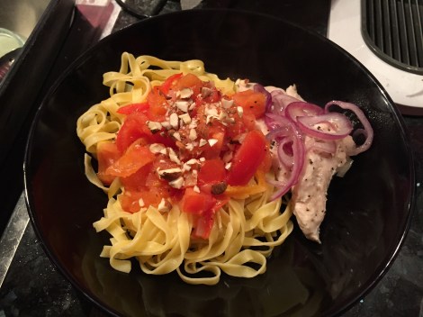 Servera kycklingen vid sidan av pastan. Dränk pastan i sås och strössla över hackad mandel.