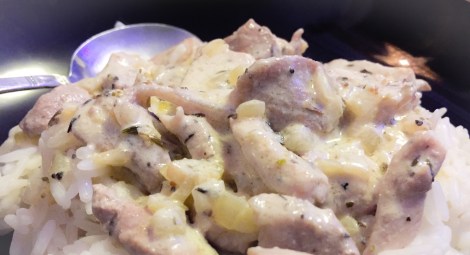 Strimla fläskfilén ganska smått (det ska gå att äta med sked). Tillsätt lite mer smör i panna och lägg i köttet med löken. Låt steka, fortfarande på medelvärme, tills köttet är nästan klart. Krydda med mer salt, peppar och timjan, samt toppa upp med oregano och vitlökspulver.