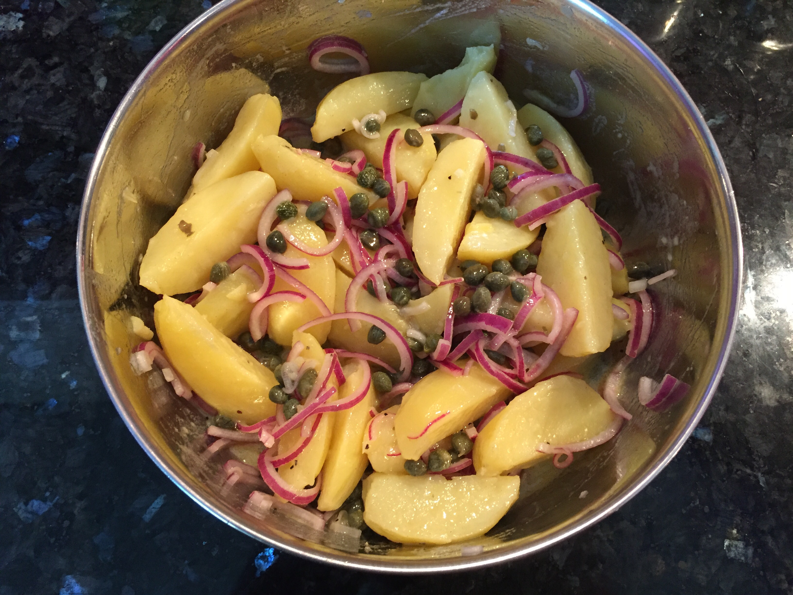 Klyfta potatisen medan den fortfarande är varm. Blanda klyftorna med löken och kaprisen. Häll över vinägretten och vänd runt försiktigt. Täck över och ställ kallt tills det är dags att servera.